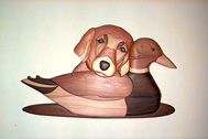 < dog with duck decoy